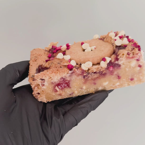 Indulge in a delightful treat with our rich, buttery gluten-free blondie bursting with luscious raspberry jam and tangy freeze-dried raspberries. This fruity combination creates a perfect balance of sweet and tart in every bite.
